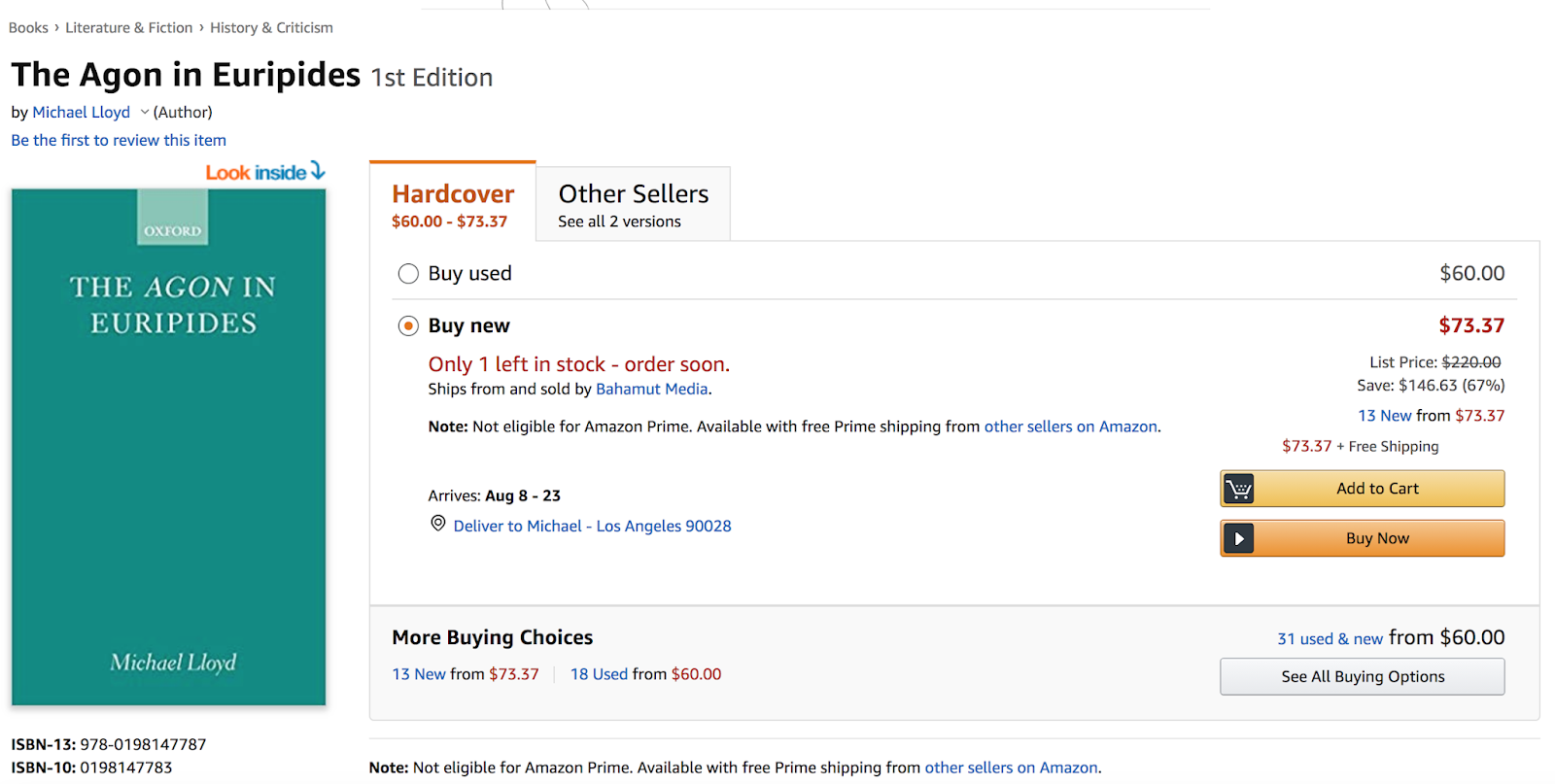 Anyway, you used to have to drag yourself to one of the only high-end art supply stores in your city to find these suckers, but not you can fire up Amazon and finish your purchased and have them delivered in a few hours. Amazon is pretty great in that respect. After taking exactly 189 seconds to research, get a proper brand recommendation, select, and purchase my pencils, I surfed around the site and and I stumbled across this first edition classic, “The Agon in Euripides,” penned by yours truly. It’s brand new and the last one in stock at $73.00. There’s also 13 more options starting at $73.37 and some more in the used book bin available from $60.00. I mean why wouldn’t you want to purchased this study of the agon, i.e., formal debate, in Euripides’ tragedies? Just look at these reviews: