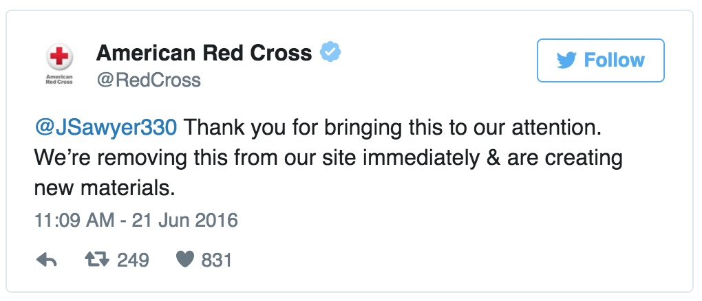 The American Red Cross responded to the masses with mea culpa stating they were creating new poster and removing the material for their site.
