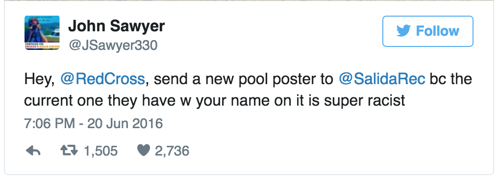 The poster went viral when John Sawyer posted the image on Twitter, calling it “super racist” and implored the Red Cross to send a new one to The Salida Pool and Recreation Department in Colorado.