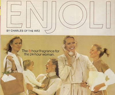 Just like the exhausted woman in this classic perfume ad, Enjoli does it all, working overtime just to please her man perhaps. Or maybe it’s telling men to buy it so he can be pleased at the bank and in the bedroom.