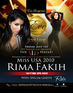 June 27, 2011 ALO HayatiEve NightclubLas VegasRima Fakih Miss USA 2010 Rima Fakih to party with the Media Guy Eva Longoria’s Eve Nightclub presents Femme Fatale Friday, July 1st. Doors open at 10pm The ALO Hayati magazine party hosted by ALO cover model Miss USA 2010 Rima Fakih For more information or table reservations 702/227-3838. Share: fb tw pn