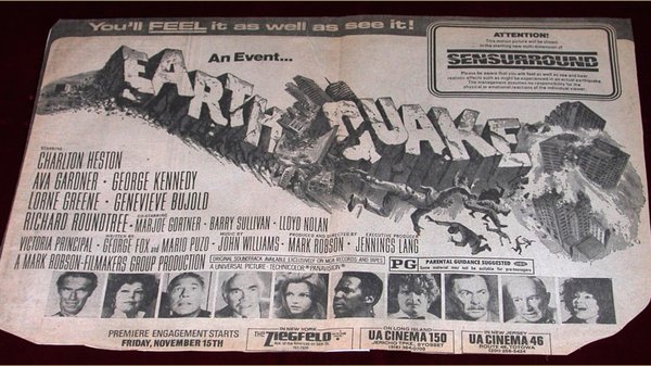 “ATTENTION! This motion picture will be shown in the startling new multi-dimension of Sensurround. Please be aware that you will feel as well as see and hear realistic effects such as might be experienced in an actual earthquake. The management assumes no responsibility for the physical or emotional reactions of the individual viewer.”