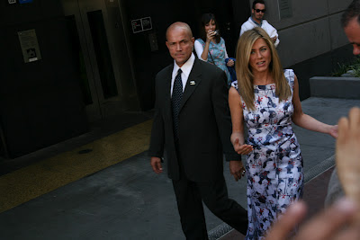 I was in the perfect spot to see everyone — Adam Sandler, Wanderlust co-star Malin Ackerman, John Aniston, Justin Theroux and the star of the day — walk in.