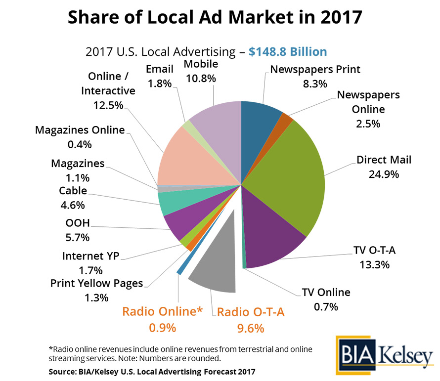 BIA/Kelsey’s 2017 Investing in Radio report details that the 2016 digital advertising income of U.S. radio stations was up 14 percent. Online radio includes locally targeted online streaming advertising on services like Pandora as well as online properties of over-the-air stations.