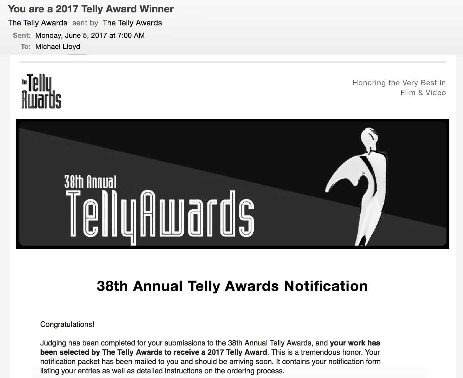 I’m checking email and low and behold, hard work pays off sometimes. I just received notification that I am officially a 10-time Telly Award winner.
