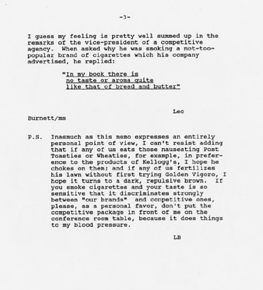 P.S. Inasmuch as this memo expresses an entirely personal point of view, I can’t resist adding that if any of us eats those nauseating Post Toasties or Wheaties, for example, in preference to the products of Kellogg’s, I hope he chokes on them; and if any of us fertilizes his lawn without first trying Golden Vigoro, I hope it turns to a dark, repulsive brown. If you smoke cigarettes and your taste is so sensitive that it discriminates strongly between “our brands” and competitive ones, please, as a personal favor, don’t put the competitive package in front of me on the conference room table, because it does things to my blood pressure.