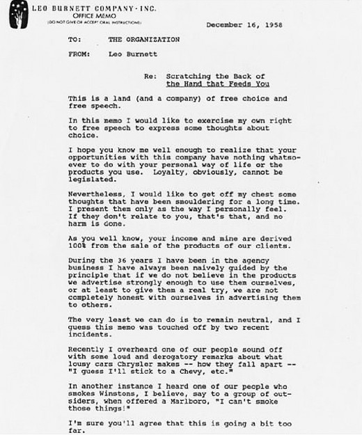 Winning awards gives you pause to reflect on big ideas. One of the things I pull out in times of reflection is the “Scratching the Back of the Hand that Feeds You” memo authored by advertising icon Leo Burnett in December of 1958.